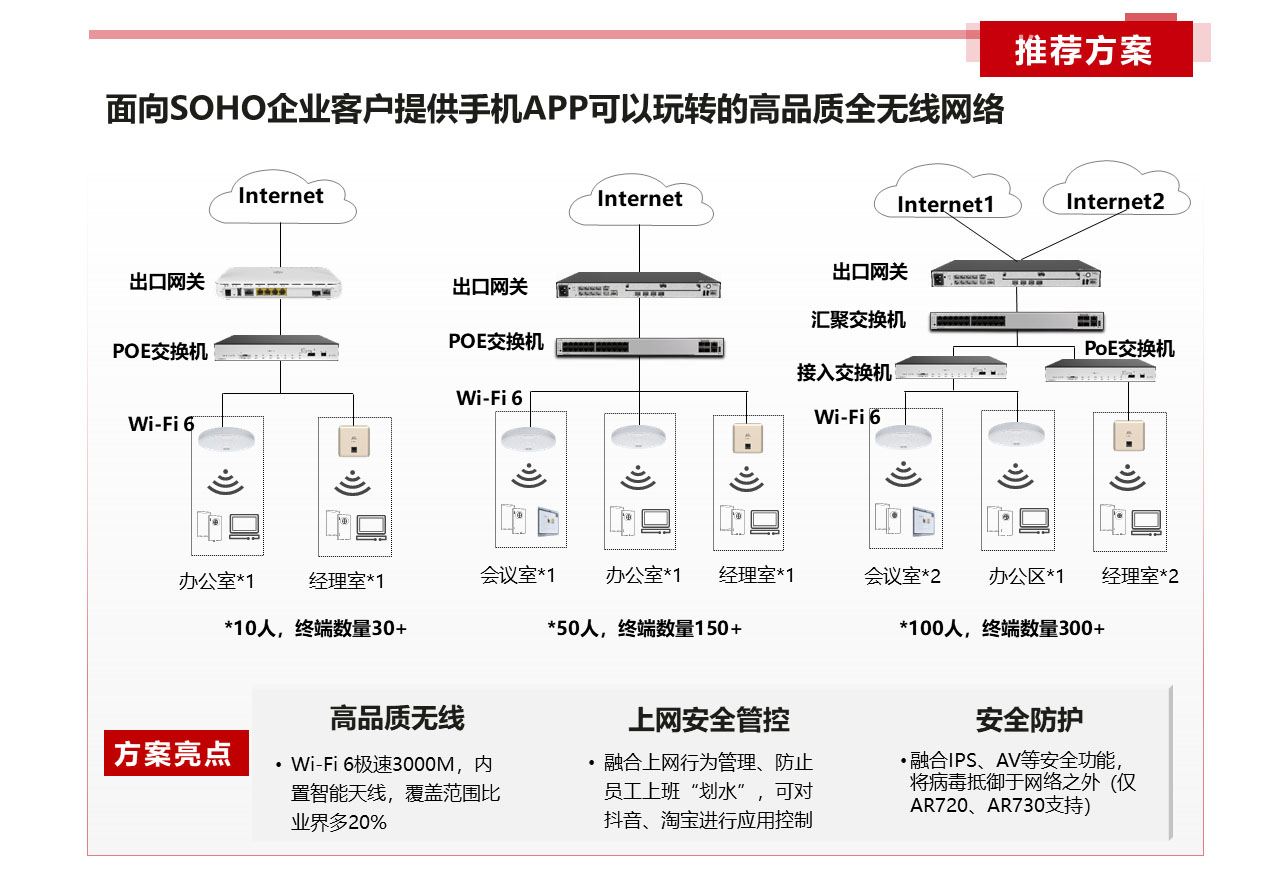 SOHO企業(yè)常面臨網(wǎng)絡(luò)覆蓋不均、安全性低及管理復雜等問題。我們推出的SOHO場景化套餐,針對寫字樓、創(chuàng)業(yè)園區(qū)和電腦城等不同場景,提供定制化無線網(wǎng)絡(luò)解決方案。采用Wi-Fi 6技術(shù),配備智能天線,提升信...